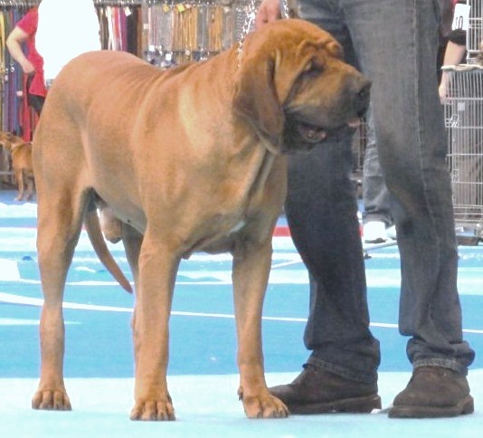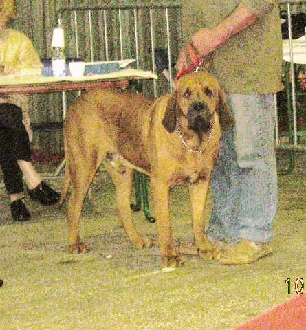 SUJET TRES BIEN TYPE /TETE POURRAIT ETRE UN PEU PLUS GRANDE EN PROPORTION AVEC LE CHIEN /SUFFISAMMENT DE RIDES SUR LE FRONT QUAND LE CHIEN N'EST PAS ATTENTIF/POURRAIT ETRE PLUS ANGULE A L'AVANT/ LIGNES DE DOS ET DESSOUS TYPIQUES /OREILLES POURRAIENT ETRE PLUS LONGUES / BONNE OSSATURE .