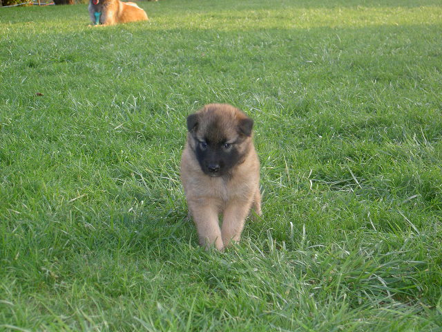 agé de 12 mois avec denture complète en petites cisaille c'est un petit modèle au minimum de la taille , en mue avec collerette , fauve charbonné . tete longue bien expressive trés bien masquée mais qui doit encore se ciseler sous les yeux , oreilles moyennes bien portées sur un crane qui pourrait etre plus rempli , le profil est un peu convexe , trés bonne pigmentation , stop efface . encolure dégagée sur un corps médioligne trés juvéniledans son ensemble , ce qui est accentué par la condition . la poitrine doit descendre , dessous enlevé , croupe légèrement fuyante , bonne angulation arriére , épaule limite , bonne ossature , bons aplombs et bons pieds . c'est un sujet qui a des qualités mais desservi par sa condition et son gabarit il est tout de meme efféminé . il sera à revoir plus agé .bon mouvement à peine serré des posterieurs avec un bon fouet bien porté