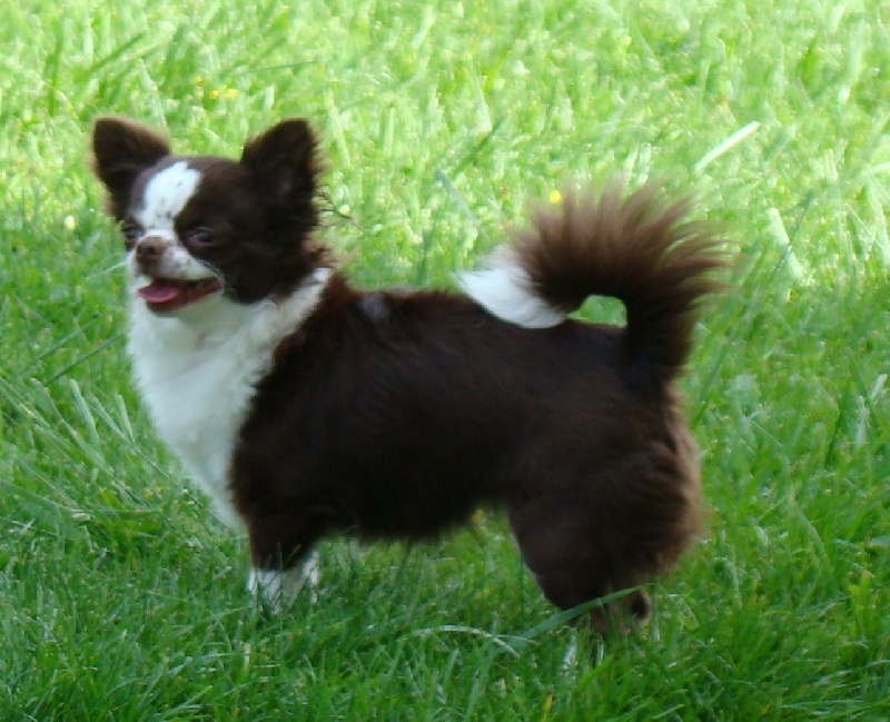 Petite fontanelle. Excellente dentition, excellent format. Jolie tête expressive. Crâne bien bombé, stop bien marqué, ossature suffisante, très bon poil, fouet bien placé allure correcte, TB port de fouet.