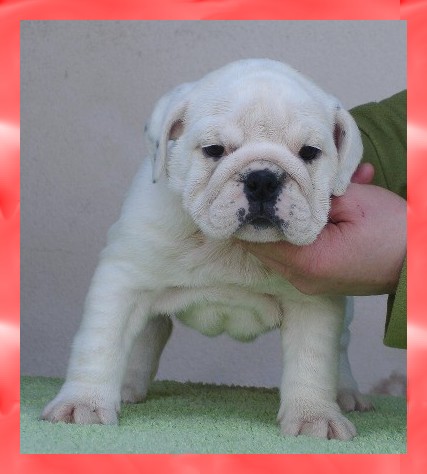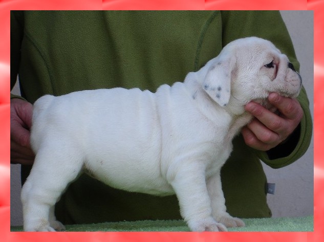 Tres Jolie femelle, présenté avec un excès de poids dessus typique, poitrail bien ouvert, membres bien ouvert. Arrière correcte, tres jolie tête, avec crâne bien plat. Oreilles en rose, yeux foncé, mâchoire bien recourbée, ex pigmentation, belle rides et plis. Marche bien.