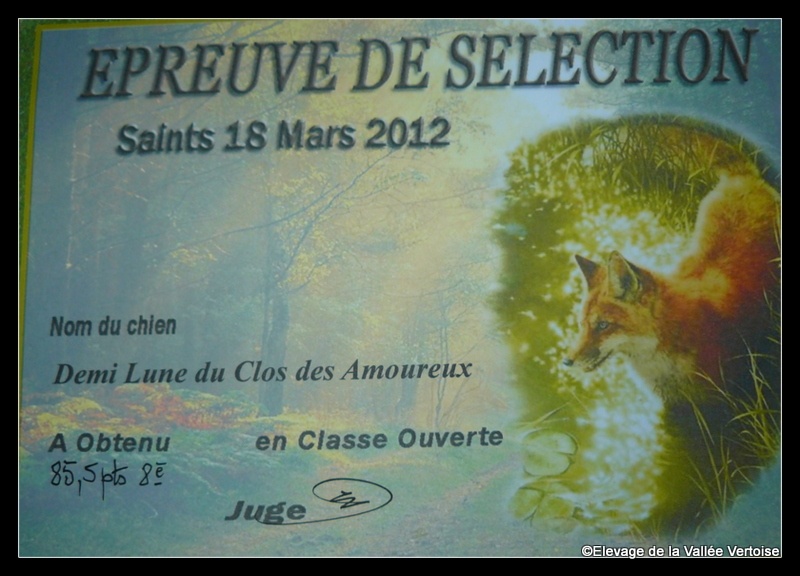 Excellente entrée mais chienne très énervée.A la levée des grilles, le renard passe jusqu'à la 3ème maire, la chienne donne à partir de la 2ème maire - à faux - la chienne monte doucement mais reste à bonne distance pour ne pas subir les assauts du renard. Le temps se termine mais à 2 caissons.