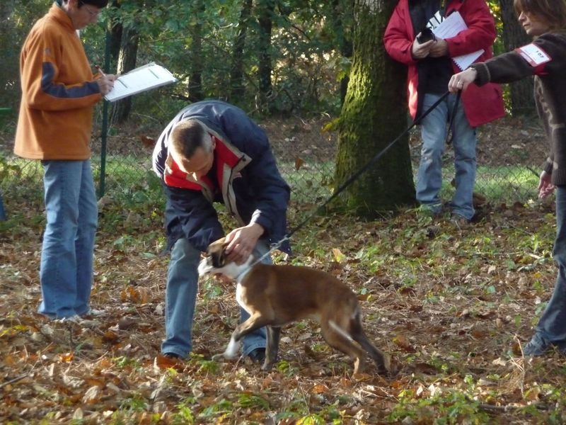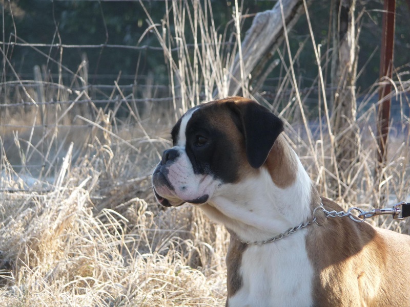 21 mois. Fauve rouge marquée en blanc. Taille moyenne. Crâne fort. Museau court et carré. Dent. large Bon prognathisme. Encolure courte et forte. Ossature preque carrée. Ang. devrait être plus marquée à l'AV et AR. Allure régulière.