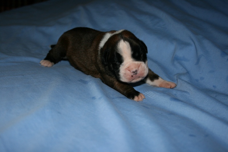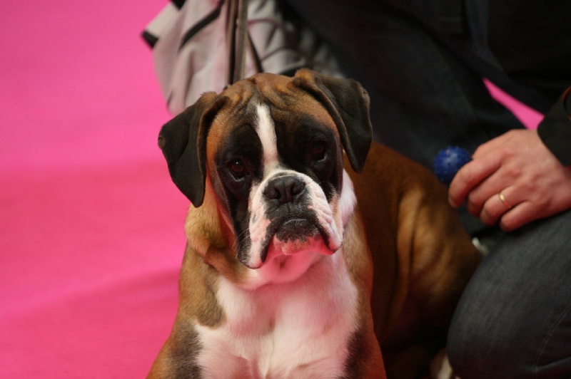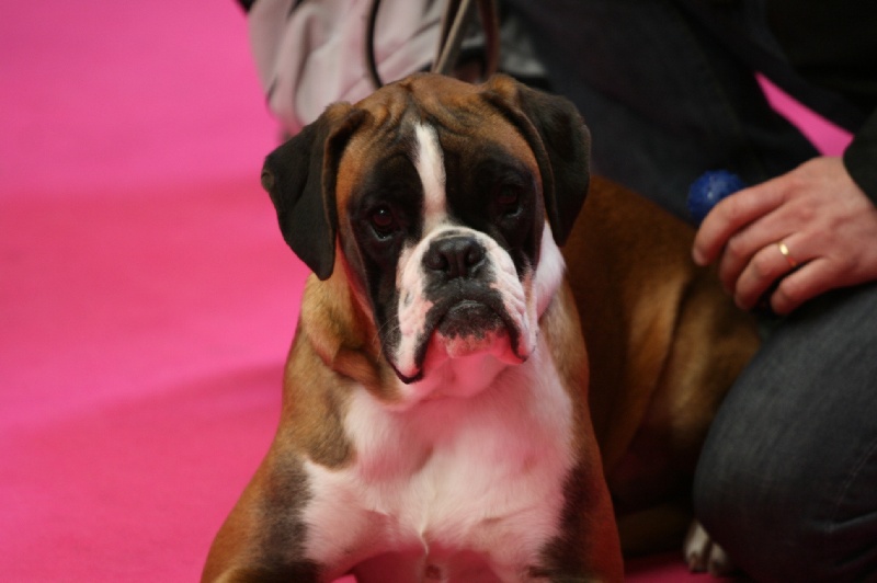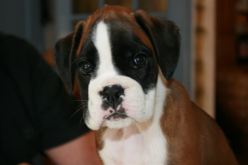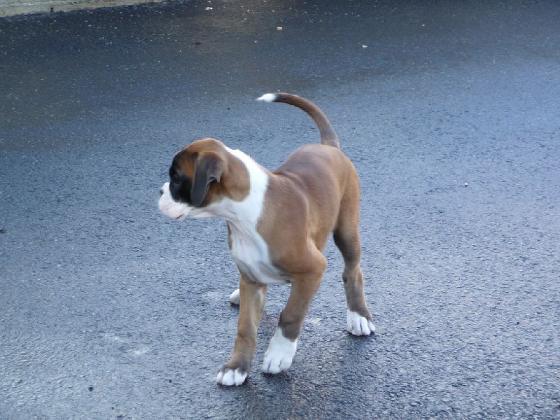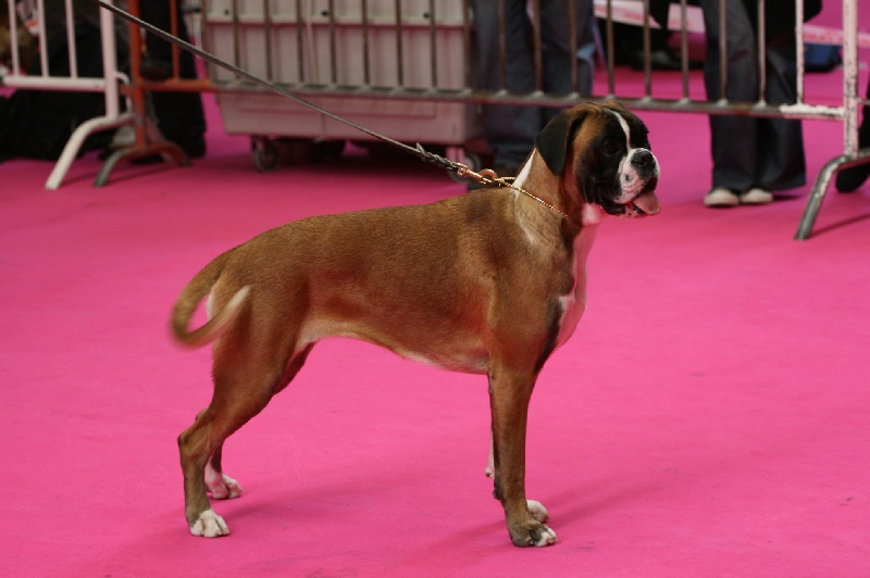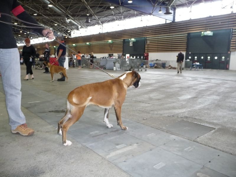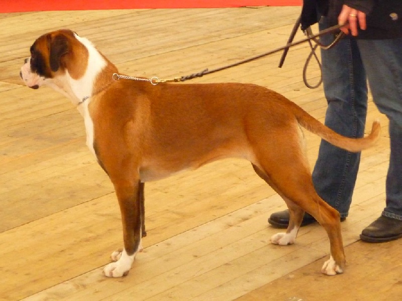 Excellente silhouette de puppy. Tête TB proportionnée. Denture correcte. Oeil foncé. TB expression TB rapport crâne/museau. Construction corps B équilibré, poitrail et poitrine en place, déjà TB dessus tenduExc ossature- cyl - angul. et piedsExc mouvements de face et de profilTB poussée et amplitudeExc caractère et présentation