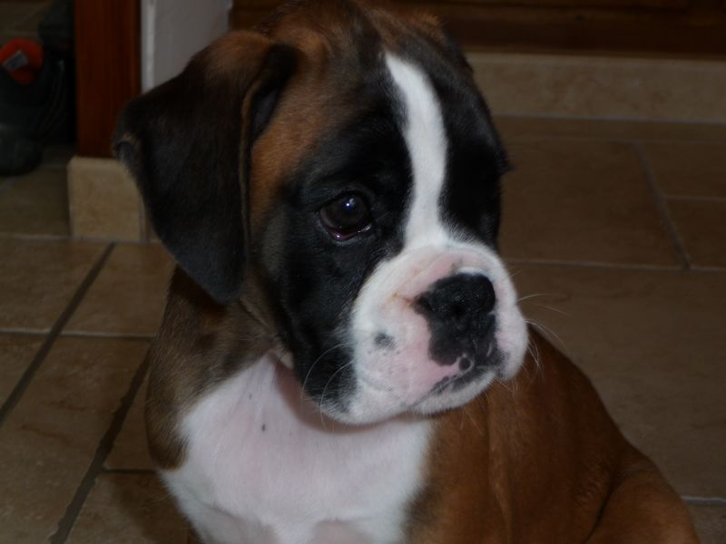 4 mois. Taille moyenne. Carrée. Élégante. Cou long. Bonne angulation. Très bonne ligne de dos. Tête typique. Yeux sombres. Bon menton. Bonne bouche. Le mouvement devrait plus fort (derrière)