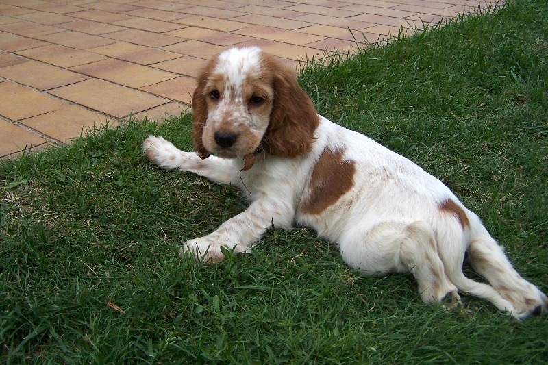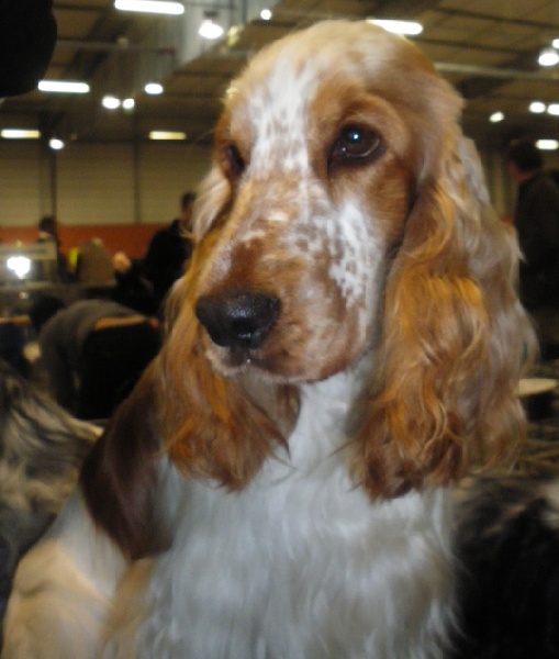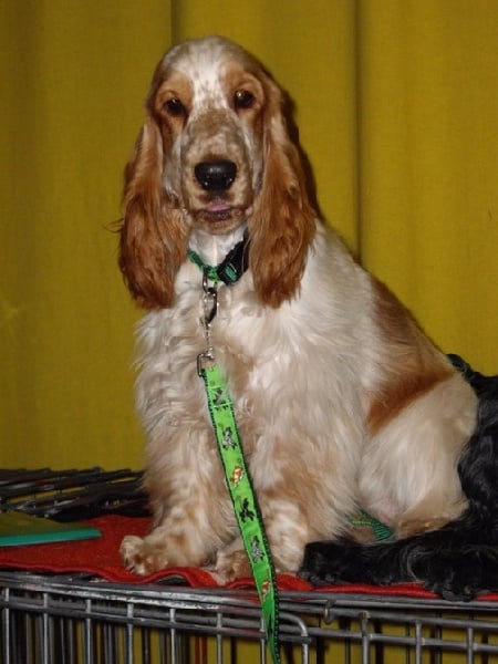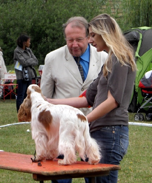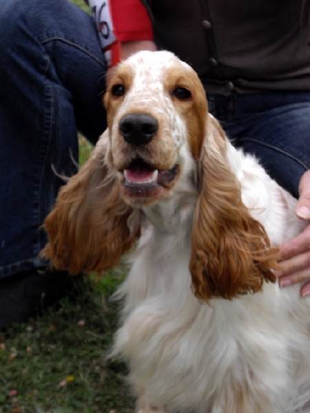 Catégorie : Cocker Anglais - Autres CouleursClasse : Ouverte Femelles.Blanche et orange. Jolie tête avec lignes parallèles. Beaux yeux. Bonne épaule, applombs et pieds. Corps assez court.Excellent poitrine. L'arrière main pourrait être plus longue.Belle qualité de fourrure.Marche correcte.