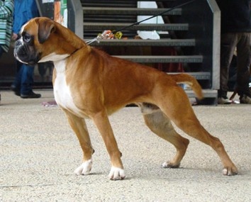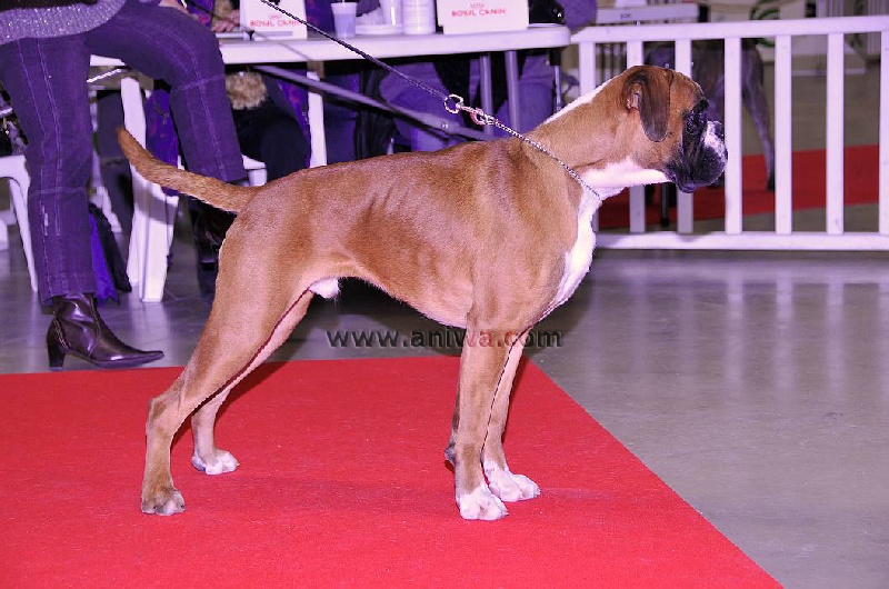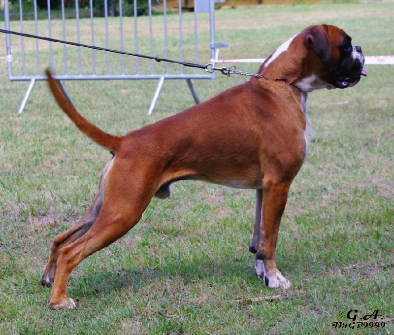 Fauve doré,marqué en blanc,trés bon type de tete avec un bon rapport crane/museau,yeux foncés,denture en ligne régulière large,Carré,bonne ossature,Poitrine déja bien dessinée,Angulation AV/AR en ordre. Belle encolure (avec un soupçon de peau)Bonne ligne de dos Mouvements réguliers avec un peu de jeu aux coudes. MEILLEUR BABY