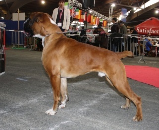 8 mois-fauve or marqué en blanc-Exc type de tete avec exc rapport c/m- Exc yeus par forme et couleur-Exc denture droite,large avec prog correct-Exc région crano frontale - const carrée avec forte encolure-Exc ang AV/AR-Exc applomb AV-Exc poitrine et poitrail- forte ossature-Exc ligne de dessus-Exc allures fonctionnelles avec fortes poussées