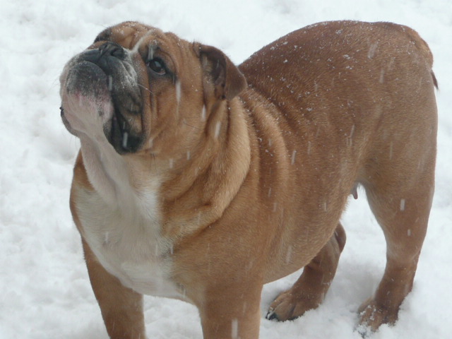 fauve.EXC construction bien dans le type.Cràne large.Belles oreilles en rose bien attachées.Oeil sombre bien ouvert.EXC lay back avec prognatisme bien ouvert Denture correct.Correct dessin de lèvre.EXC poitrine en poire.Queue droite bien attachée.Epaules bien rapportées avec coudes bien rapportés.Angulation arr un peu trop droite.B démarche avec un pas de patineur.