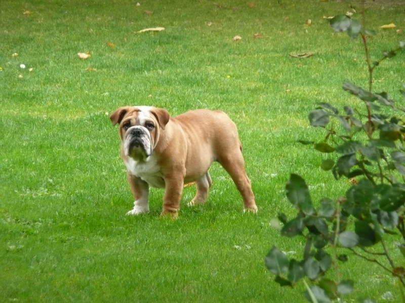 fauve soutenu blanc limité.EXC cràne.Oreilles en bouton bien placées.EXC lay back.Prognatisme correct.EXC denture sur 1 màchoire bien large.Oeil sombre bien placé.Côtes bien rondes.EXC ligne de dessus avec une queue droite bien bas.B avt.Applomb correct solide.Beau mvt avant.EXC pas du patineur à l'arrière.EXC caractère.EXC présentation.