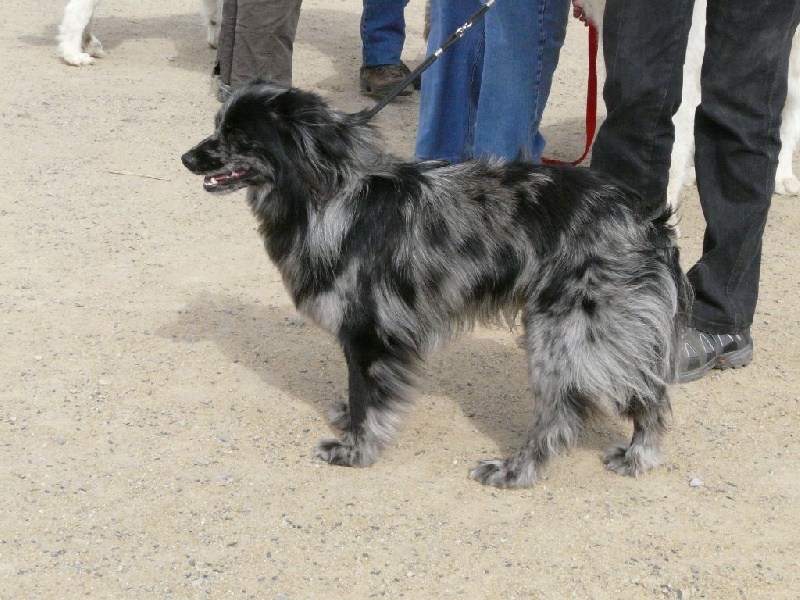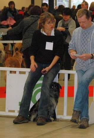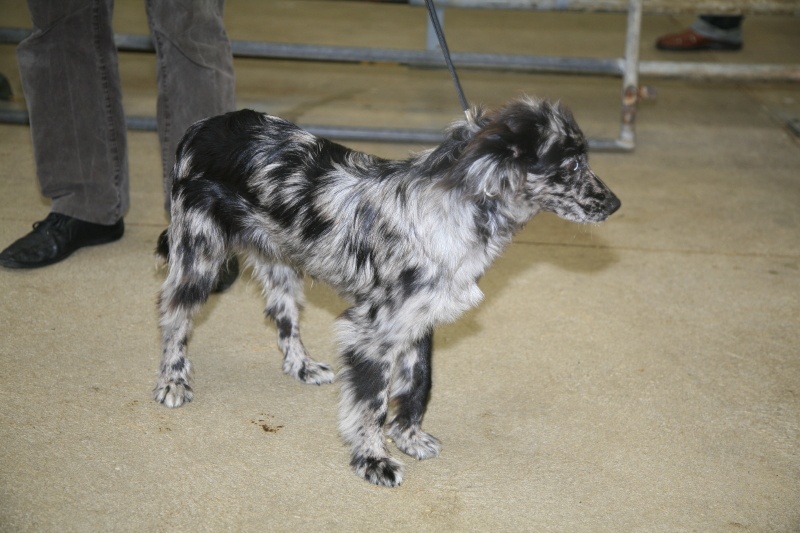 Joli modèle déjà dans le type - jolie tête - bon chanfrein - excellente construction - bon dessus - bonne ossature - jolie couleur arlequine - exellent déplacement.Commentaires du chien : tout le monde dit que j'ai une jolie tête typée, mais sur cette photo cela ne se voit pas (je suis planqué derrière les jambes de mon éleveuse) je suis encore un jeune chien et il y avait du monde à Vincennes