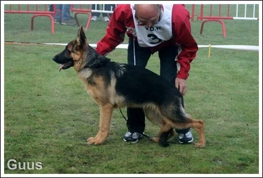 Middelgroot middel krachtig, ZG verhouding, ZG bovenlijn, ZG voor en achterhandhoekingen, ZG onderlijn, stand + beweging correct en wijd uitgrijpende gangen.