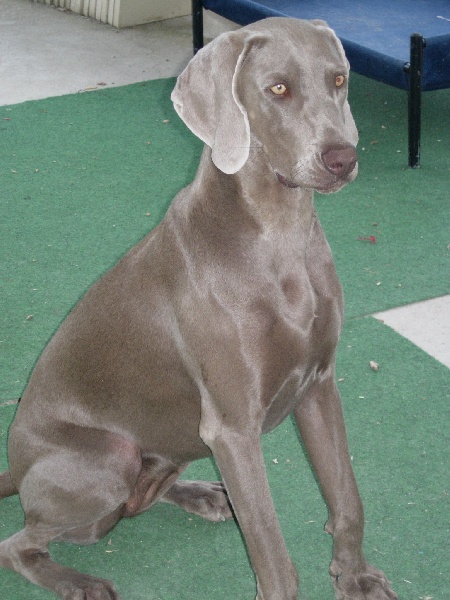 - (62cm) bonne tête, le museau pourrait être plus long, crâne conforme au standard, excellents yeux et oreilles, belle encolure, dos long bien tendu, exc poitrine dans les trois dimensions, membres secs, exc pieds, un peu droite sur ses membres, démarche difficile, fouet écourté correctement porté, exc poil pigmentation un peu foncée