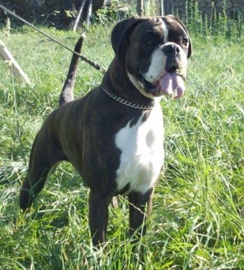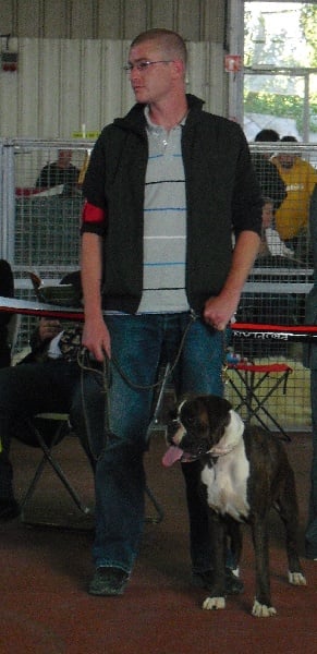 Classe : Puppy7 mois bringée marqué en blanc - très belle expression - bonne tête - museau plein - yeux noirs et ronds - prognathisme correct - denture moyennement large - j’aimerais un menton plus marqué - excellente construction - excellente ligne dessus dessous - très bonne angulation avant arrière - bon mouvements