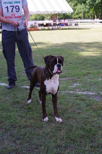 Classe ouverte :20 mois, bringé marqué en blancTaille correcte, B proportion, B expression, yeux un peu clairs, museau puissant, B crâne, denture large avec B prognathisme, construction presque carré, exc ossature, TB ligne dorsale, Femelle en forme, TB angulation AV, Exc angulation AR,TB mouvements.