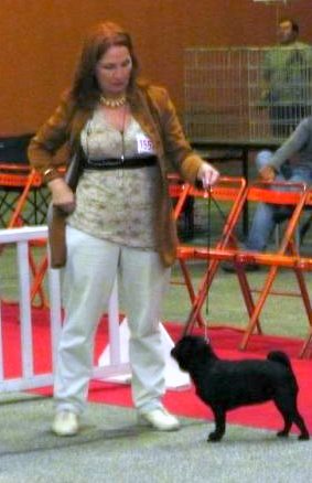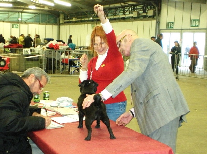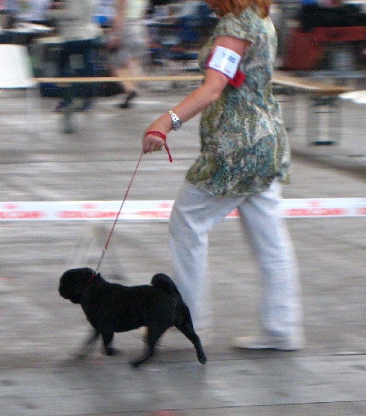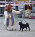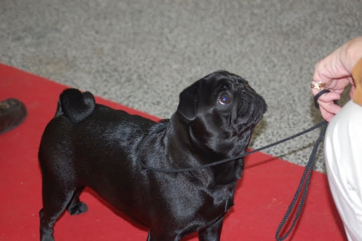 Lovely small ears - Well wrinkled head - Correct teeth - Good dense coat - Nice compact body - Shy neck - Good bone - Good tail carriage - Good feet - Good angulation - Good driving movement - Well handled.(Jolies petites oreilles - Tête bien ridée - Dentition correcte - Manteau de bonne densité - Joli corps compact - Encolure élancée - Bonne ossature - Bon port de queue - Joli pied - Bonne angulation - Bon mouvement dynamique - Bien présentée.)