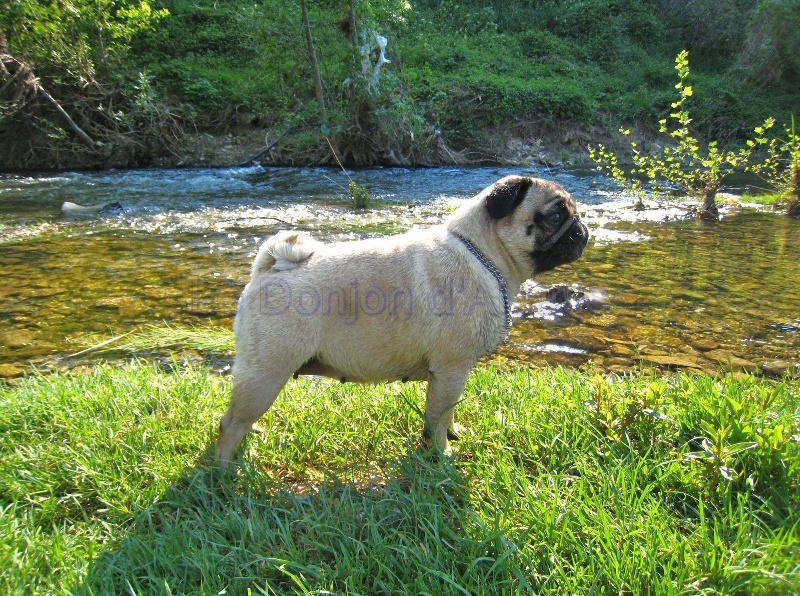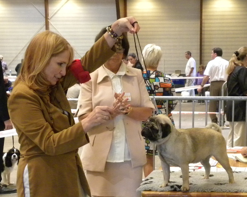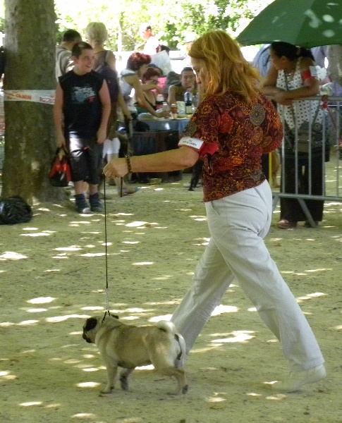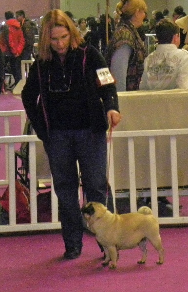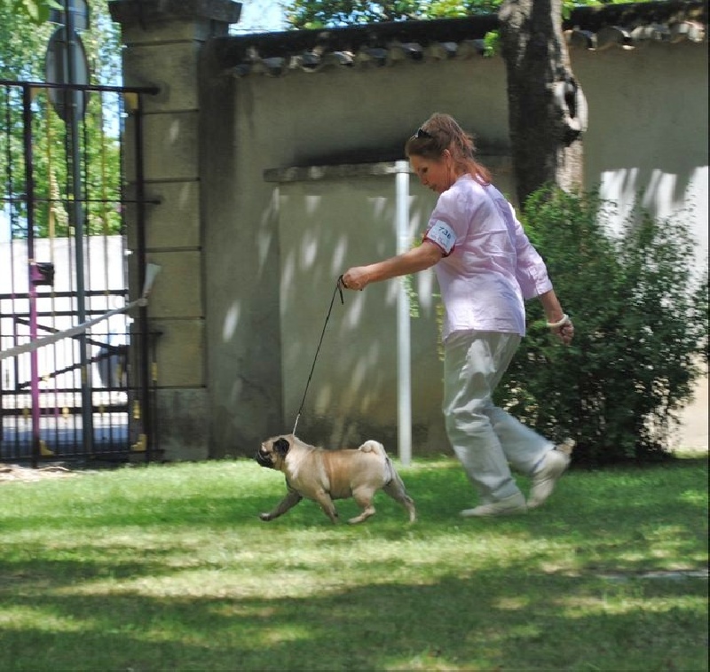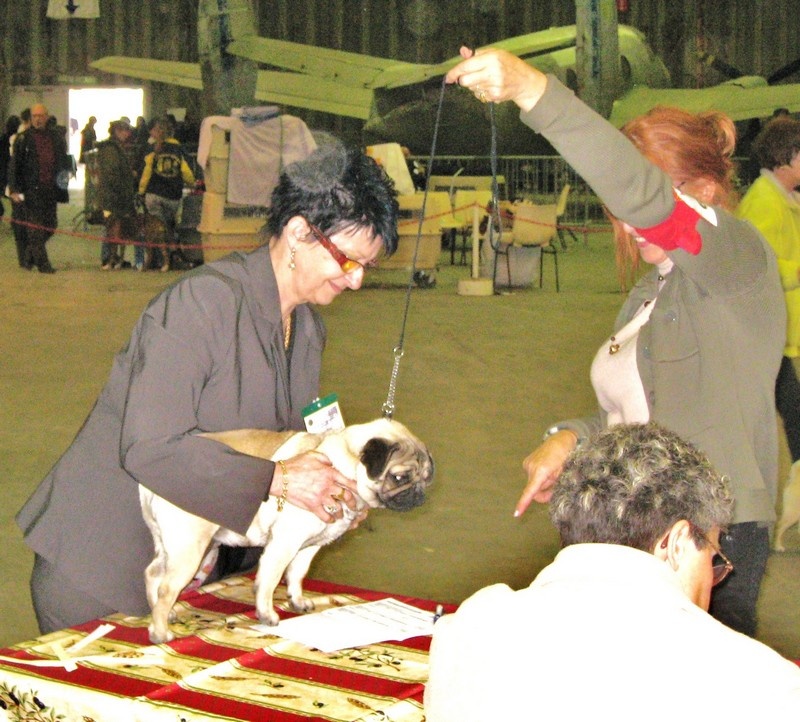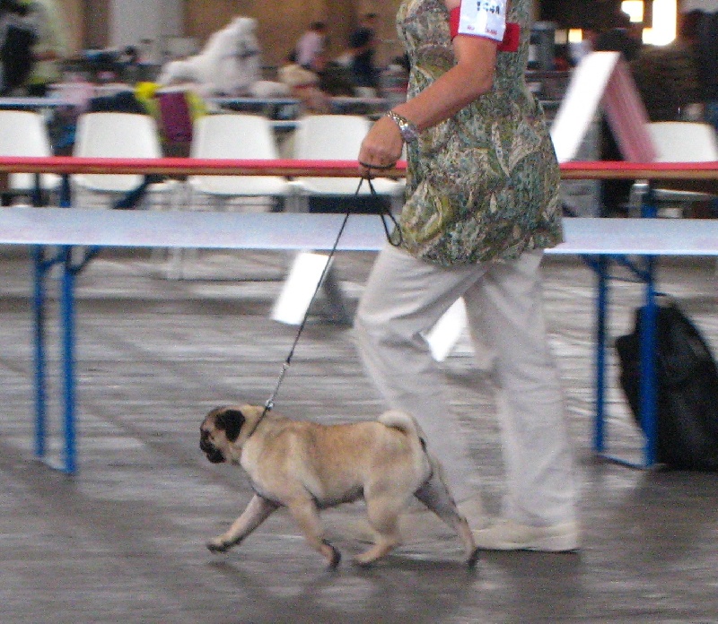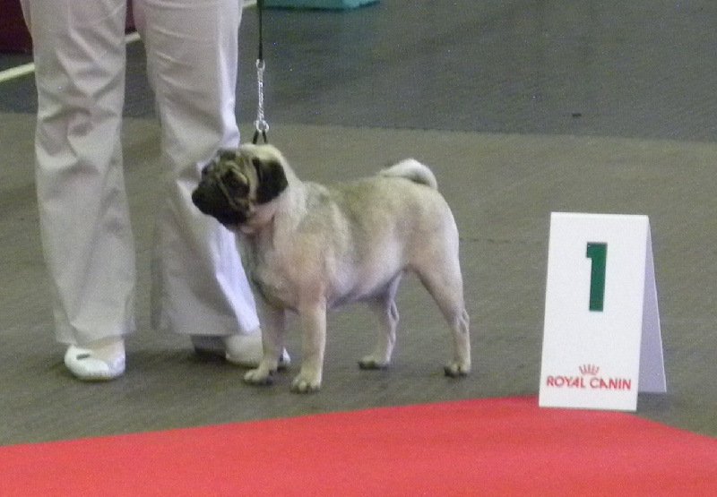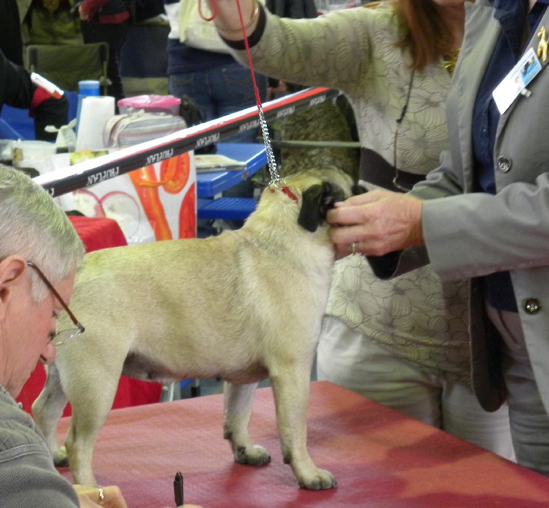 Excellent sujet - Excellentes proportions - Excellentes rides en tête - Très bonnes oreilles - Excellents yeux - Excellentes pigmentation et narines - Excellente denture - Excellent avant-main - Excellentes poitrine et ligne de dos - Queue bouclée et plaquée - Excellents postérieurs - Jolie robe - Excellente démarche
