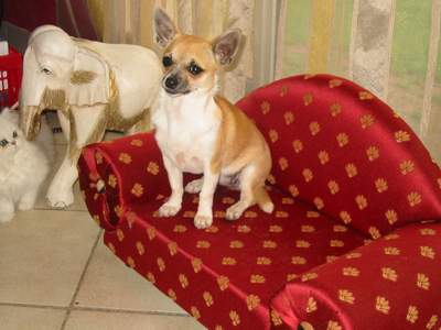 grand modèle, 3 kg, dentition légèrement prognate, excellente pigmentation, type en tête un peu juste, museau étroit, chanfrein un peu long, belles oreilles, corps long, belle sortie d'encollure, excellent caractère bien équilibré.