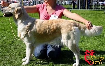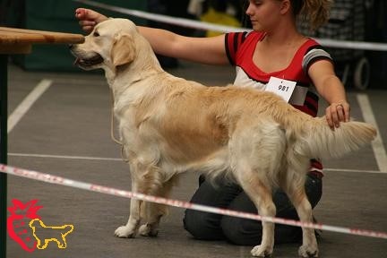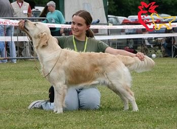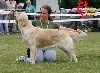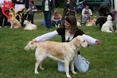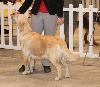 Fauve clair, pourrait avoir meilleure ossature, tête un peu fine, présentation en mue, chienne vie et gaie, ang. correct, Exc dessus, B développement thoracique, Rein un peu long, Exc mouvement, chienne gaie et dynamique