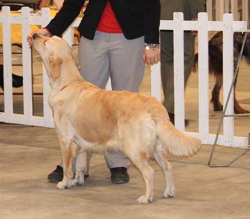 19 mois, tête correcte, yeux trop rapprochés, stop fuyant, excellente pigmentation, bonne dentition, excellente sortie d'encolure, bonne ligne de dos, attache correcte, angulation avant correcte, bon reins, cage thoracique correcte pour son age, préfère les angulations arrières plus prononcées et aplombs plus fermes, mouvements correctes, perd sa ligne de dos, bonne présentation