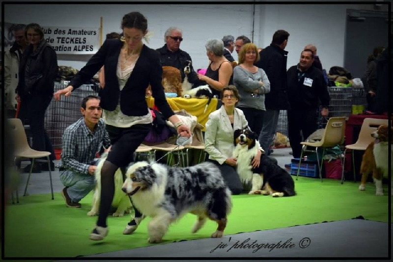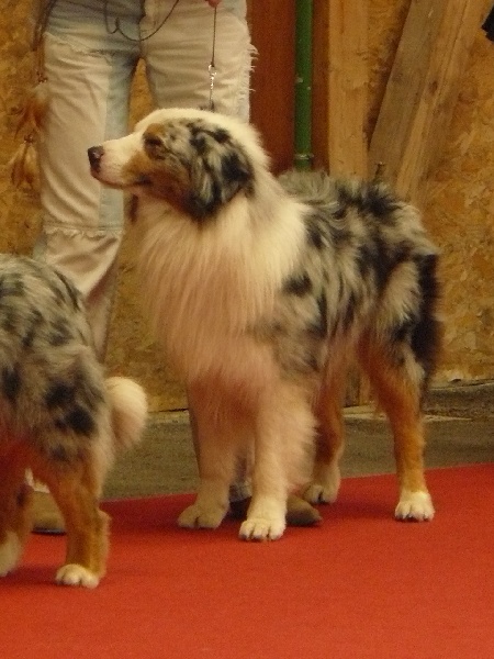 DCC, bonne taille, TB tête, chanfrein un peu fort, TB crâne, oreilles bien placées, ligne du dessus pas assez tendue, croupe légèrement surmontée, poitrine correct, angulations un peu ouvertes, bon aplombs, robe merle tri, pigmentation incomplète, bonne démarche