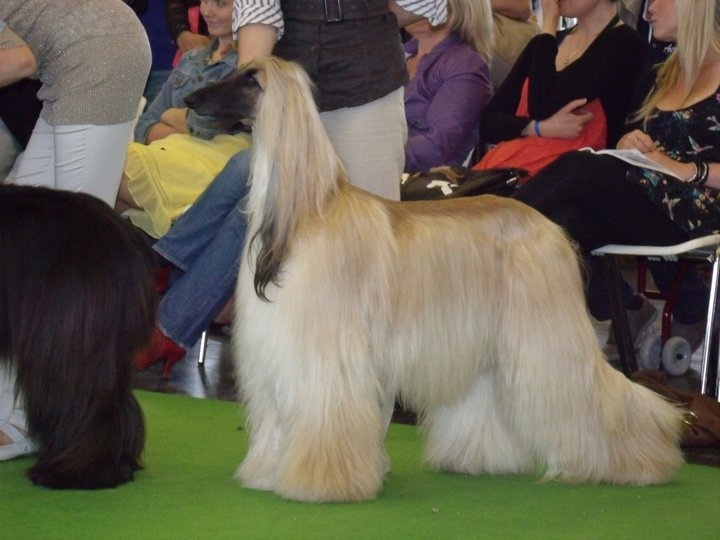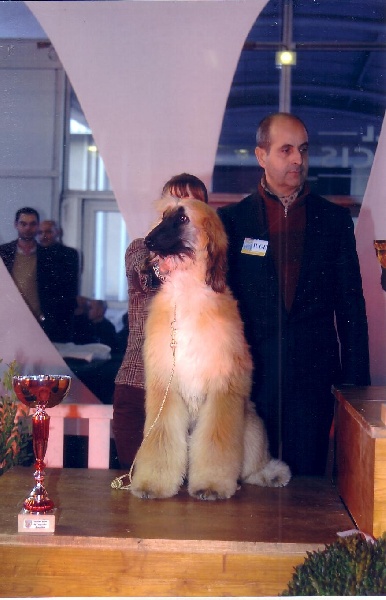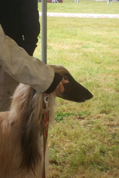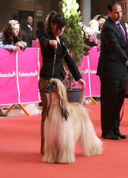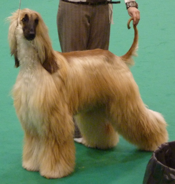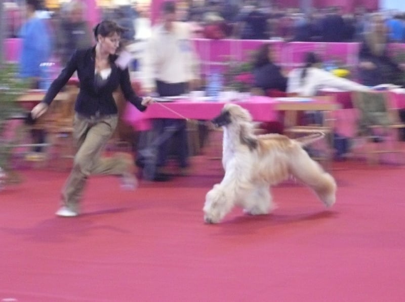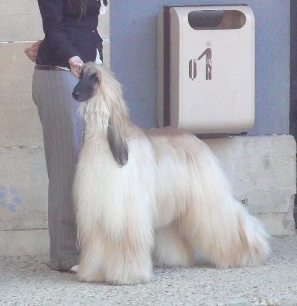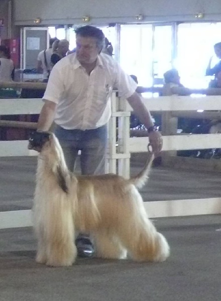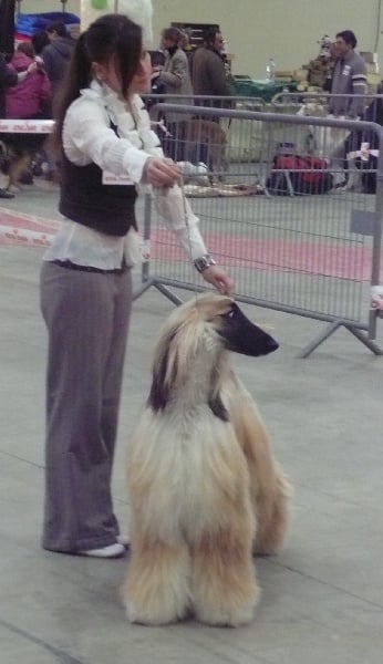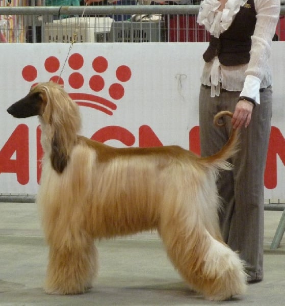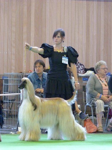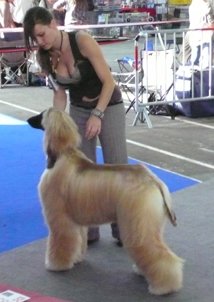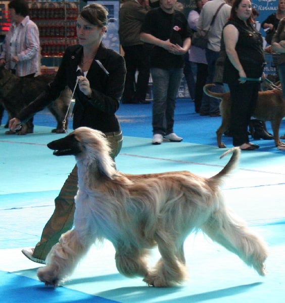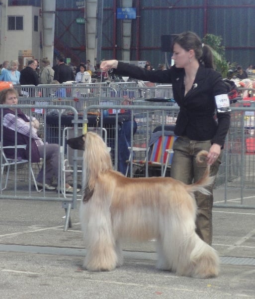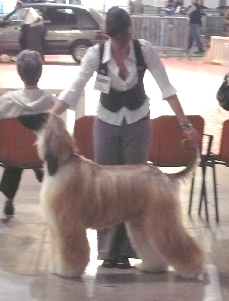 Chienne très harmonieuse. Tête expressive masquée. Oeil un peu ouvert. Bonne sortie d'encolure. Corps bien calibré et charpenté. Angulation avant et arrière correctes. Excellente présentation. (Merci infiniment à Sophie d'avoir présenté Diamant sur le Ring d'Honneur, pour la première fois avec un afghan... je dis Chapeau!!!! Merci également à M. Monedero qui a jugé le Best In Show Puppy!)