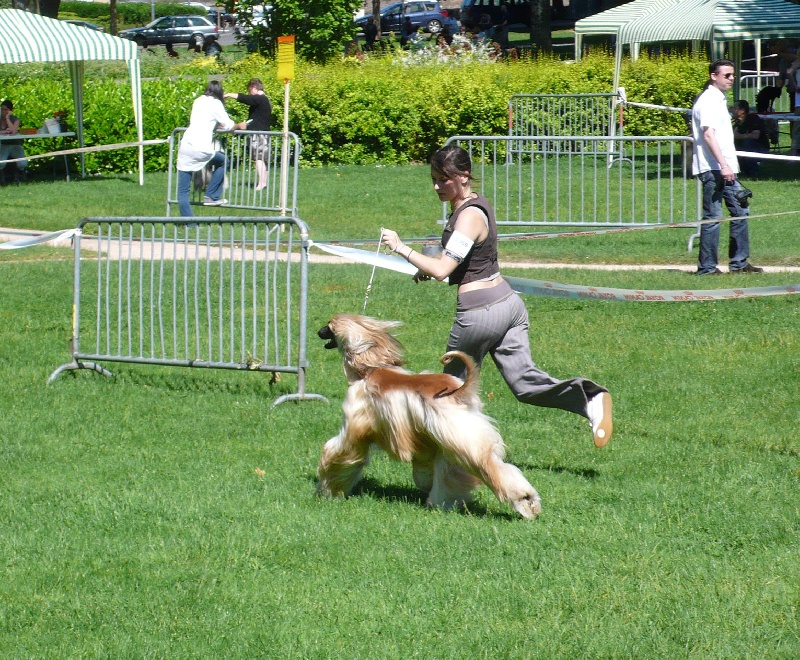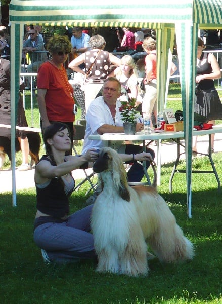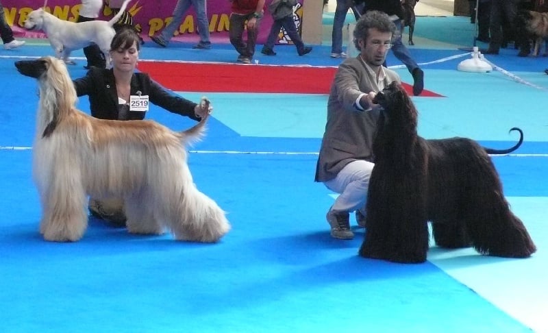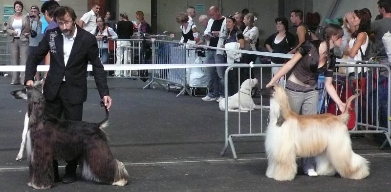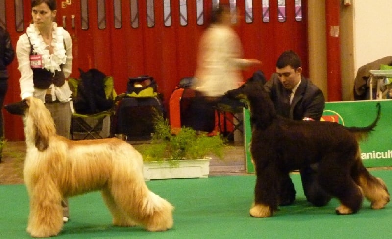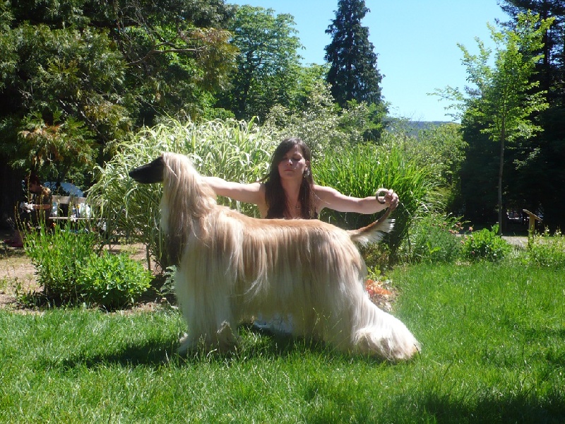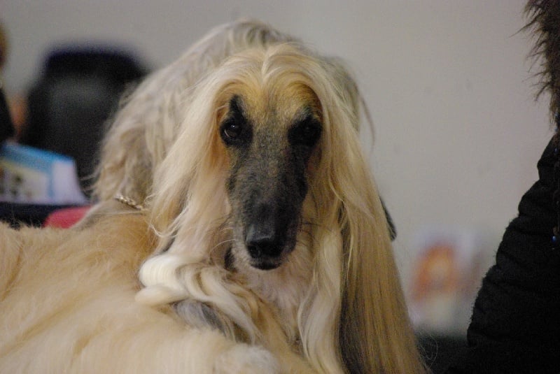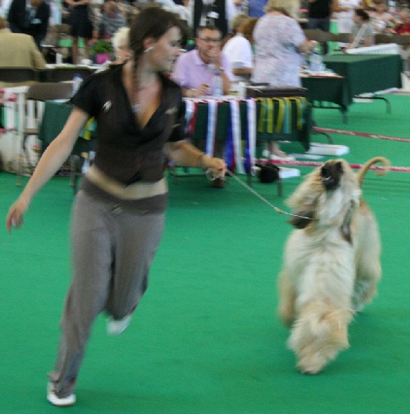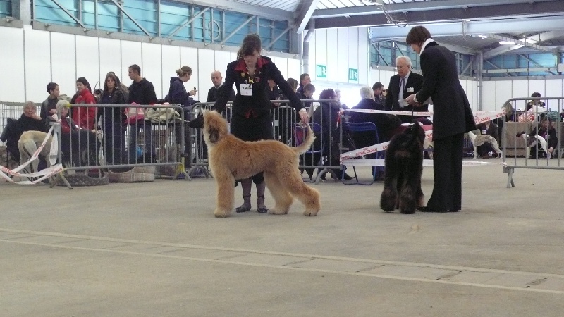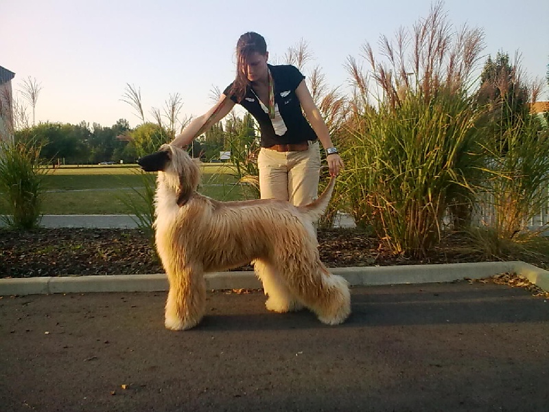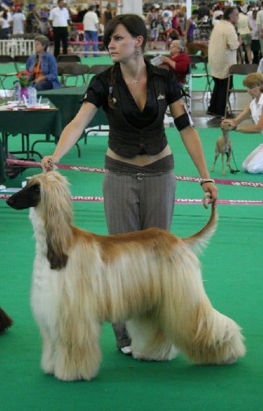 Chienne très harmonieuse. Tête expressive masquée. Oeil un peu ouvert. Bonne sortie d'encolure. Corps bien calibré et charpenté. Angulation avant et arrière correctes. Excellente présentation. (Merci infiniment à Sophie d'avoir présenté Diamant sur le Ring d'Honneur, pour la première fois avec un afghan... je dis Chapeau!!!! Merci également à M. Monedero qui a jugé le Best In Show Puppy!)