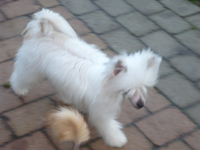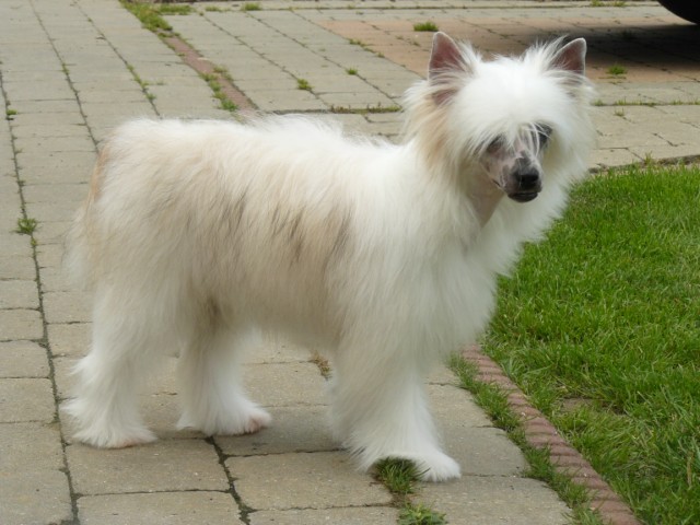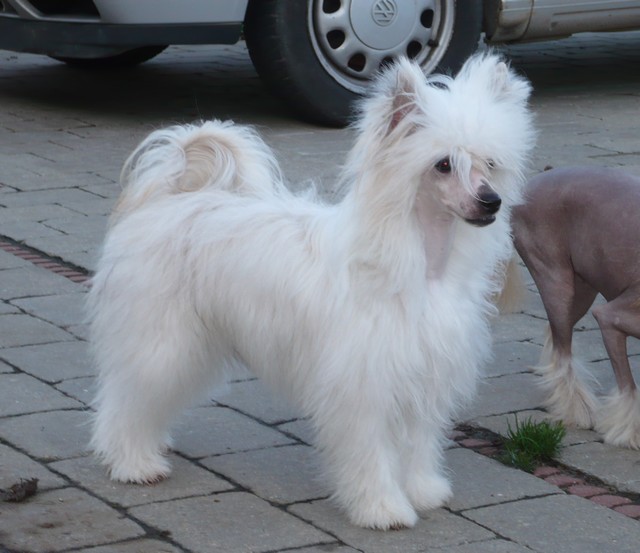 Elle mesure 28 cm et pese 4kg, elle est un petit gabarit, une fourrure soyeuse blanche et beige avec les pointes noire.
