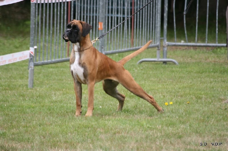 Grande, dans la tolérance. Carrée.Bien angulée derrière, suffisamment devant.Pieds de chat-Belle poitrine.Dessus solide.Encolure puissante et bien dessinée.Jolie tête avec yeux foncés.Excellent crâne, oreilles bien attachés.Excellent stop.La truffe doit encore se remoucher.Museau bien cubique.Excellent mâchoire avec prognathisme normal.Excellent mouvement.2éme Excellent en classe Jeune Femelle Fauve.