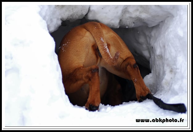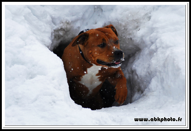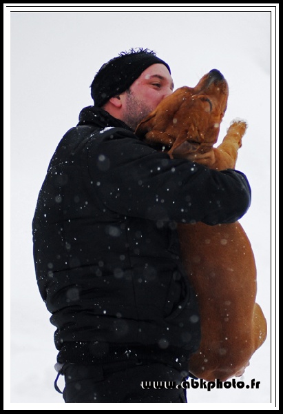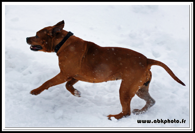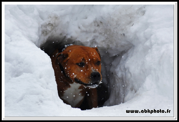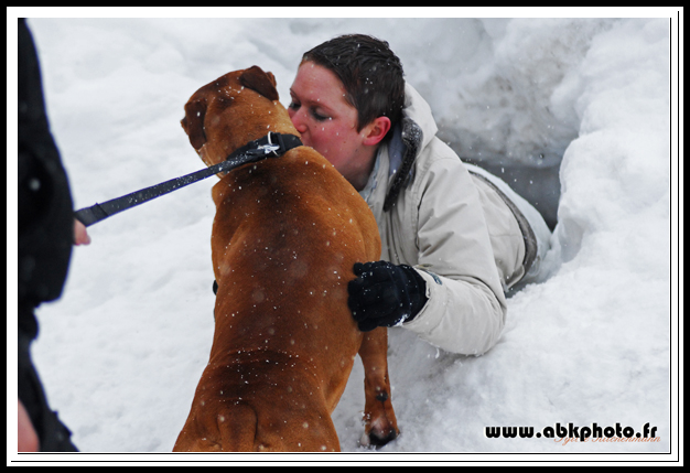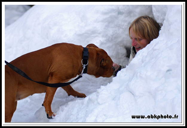 Chienne très typé, 48cm au garrot pour 28kg, a fait quelques expos avec de très bons résultats (plusieurs CACS et RCACIB à son actif) mais se focalise maintenant sur le travail en avalanches (voir son album photos).