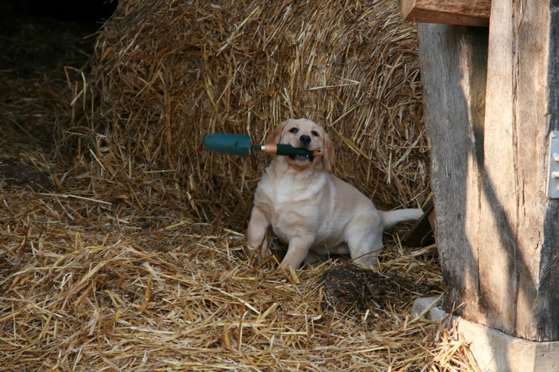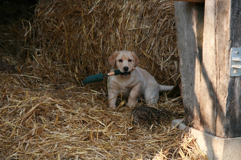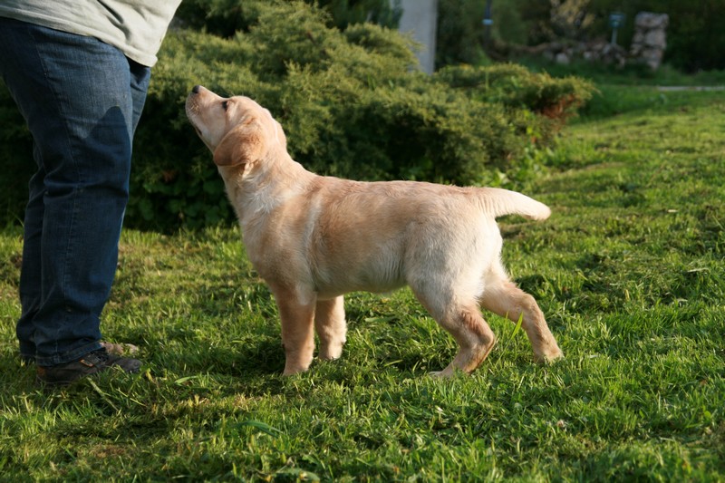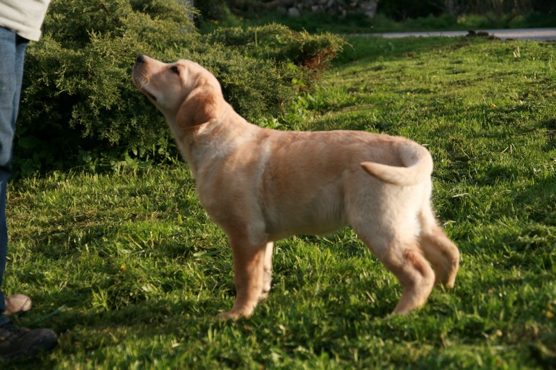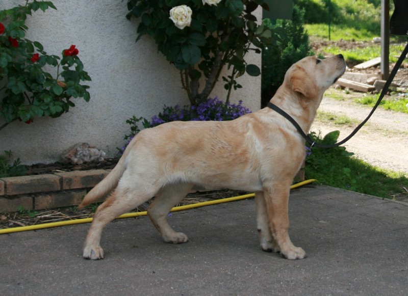 4 mois 1/2. Jaune. Très harmonieuse, exc.ossature, bien développée pour son âge, jolie tête, exc. pigmentation et expression, exc.avant main, aplombs bien droits, jolis pieds de chat. Exc. arrière main, bon dessus, rein court, belle qualité de poil, exc.dans son mouvement, exc. présentation.