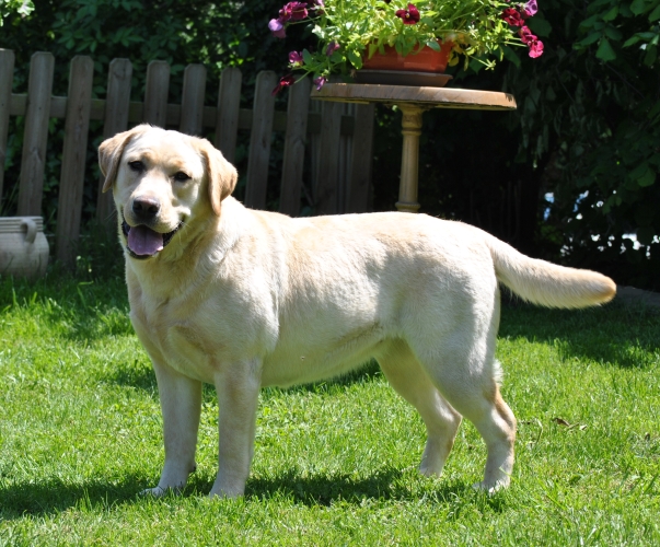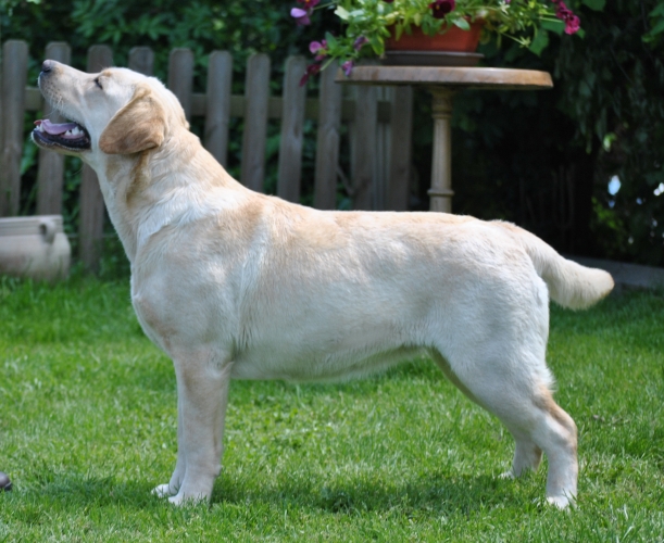9 mois. Joli modèle jaune avec une bonne tête et expression sur une bonne encolure, la poitrine et le poitrail sont correctement développés mais restent évidemment à finir, bonnes angulations avant et arrières, bon rein, bonne ligne de dessus qui pourrait être plus tendue, bonne attache de queue, bonnes allures vives et régulières.