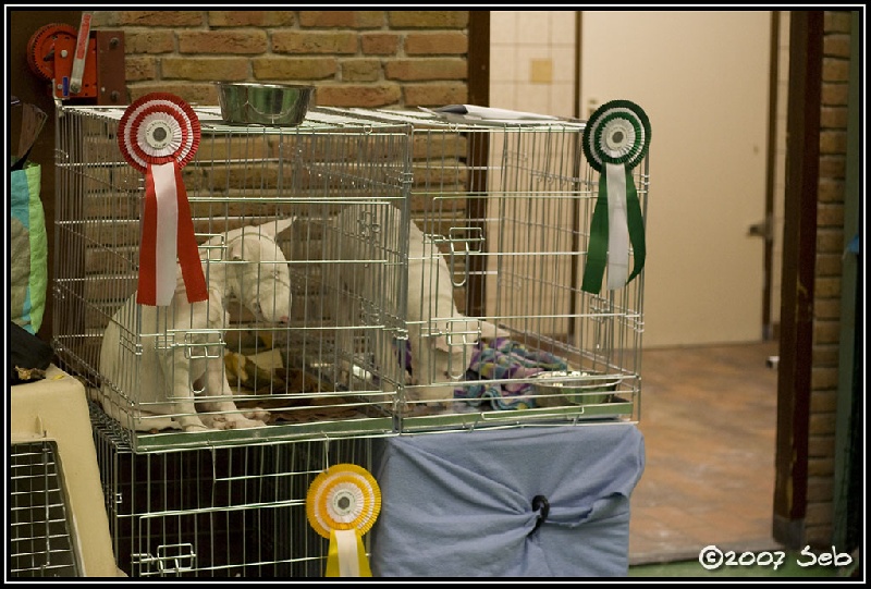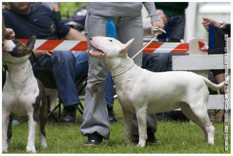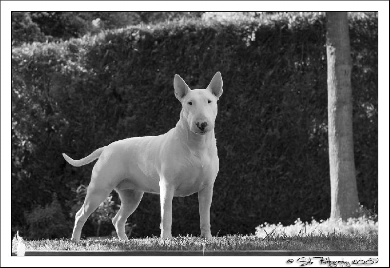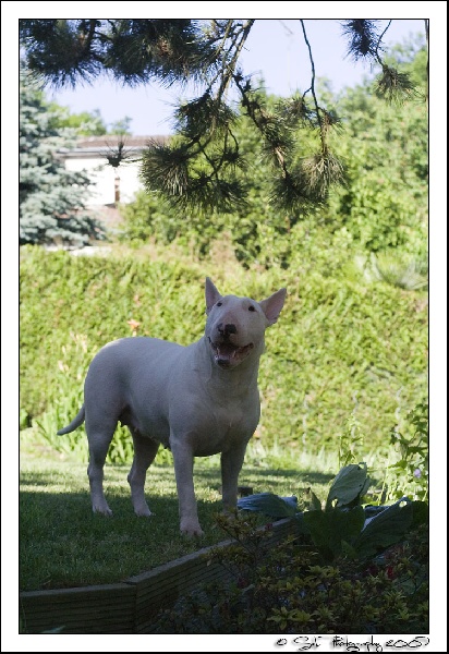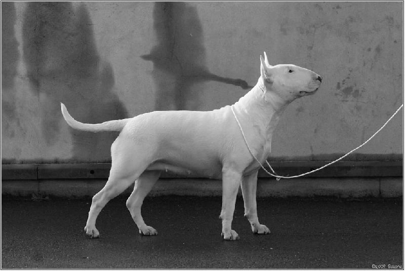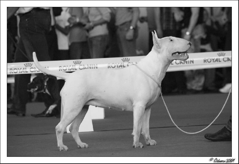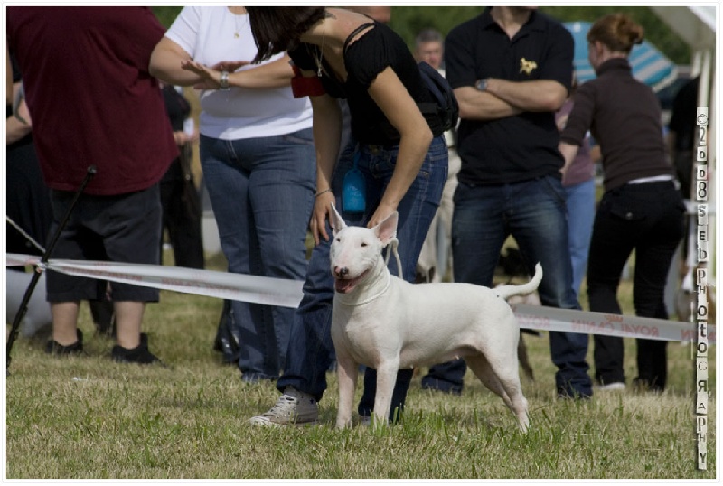 Son pédigrée est exceptionnel en France. Elle a un très joli parcour en expositions canines et ne participe uniquement qu'aux shows spécials Bull Terrier jugés par des juges éleveurs spécialistes de la race.
