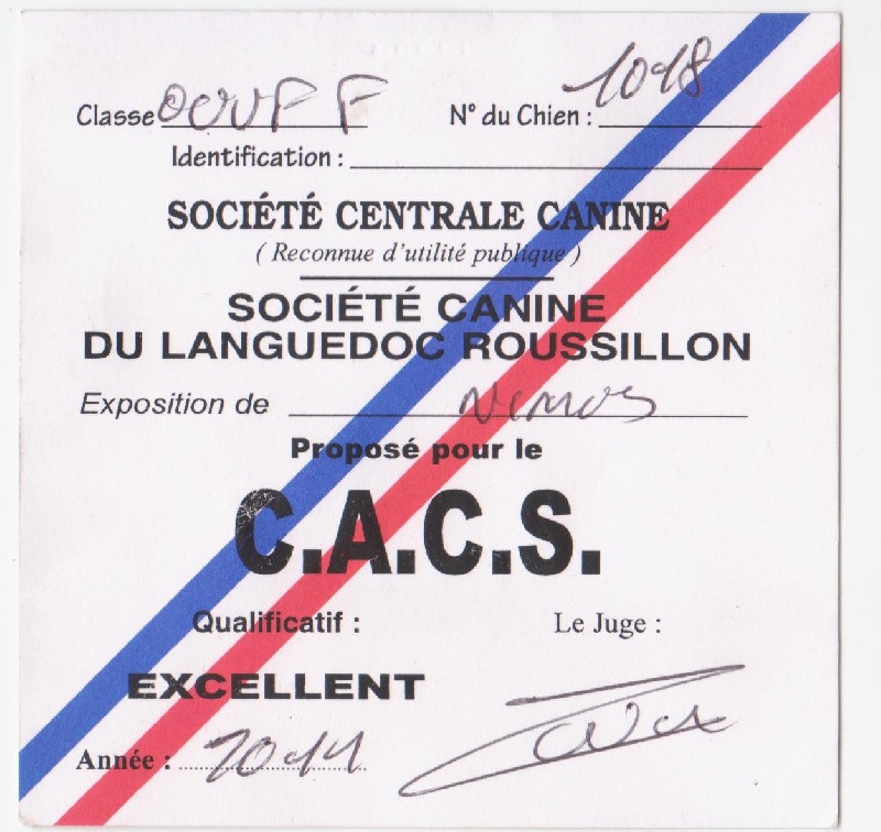EXC sujet , EXC proportion ,EXC crâne , oreille de bon format ,EXC yeux ,TB denture ,EXC épaule et avant main ,EXC poitrine et ligne de dos ,EXC posterieurs , B queue ,EXC robe ,