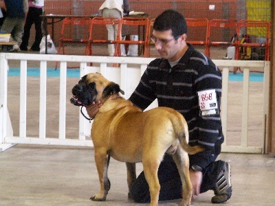 Très bon sujet, Puissant, forte Ossature, poitrine + poitrail bien développés, grand, construction typique,Jolie tête, exc masque, stop bien marqué, prognathisme fort, museau suffi. puissantdémarche correcte.ExcellentClassement 1erMeilleur de Race.