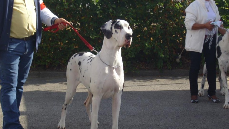 Femelle de grande taille avec du tempérament fond de robe blanc pure.DCC avec petites dents. Tête fine bien ciselée aux yeux foncés un peu trop enfoncés,paupières non pigmentées tête divergente.Oreilles implantées haut,long cou bien galbé dos long presque droit ferme.Poitrail bien développé,bonne croupe.Se tient droite sur les pattes avant,un peu serré de l'arrièreEn mouvement le dos remonte légèrement angulations avant bonnes,arrière 1 peu serréesDémarche libre un peu courte à l'arrière. Très belle chienne,bonne présentation