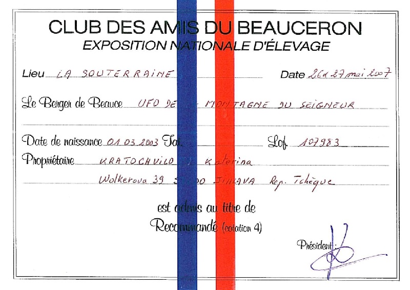 A la nationale d'élevage 2007 à la Souterraine, Ufo se classe 2ème de la classe travail et au final obtient la 2ème place sur le podium en faisant le RCACS.
