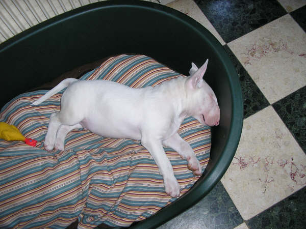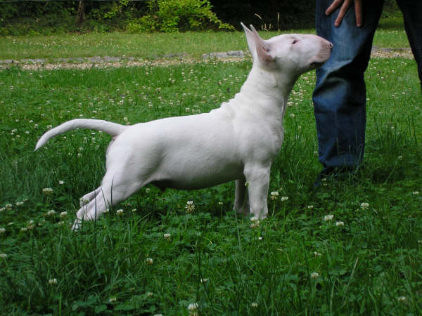 7 months white still rather rangy, beautiful arc to his head, perfect mouth, eyes seemed slightly inflamed, good topline + bend of stife, tight feet.