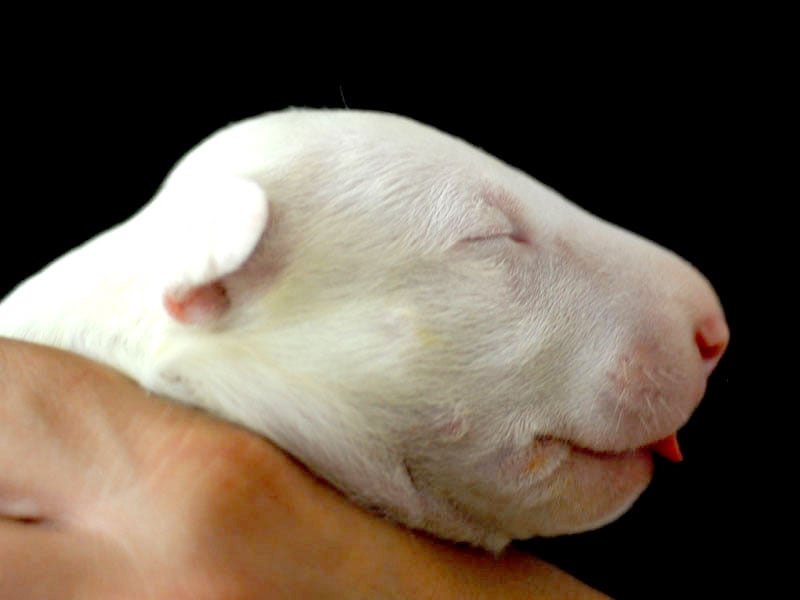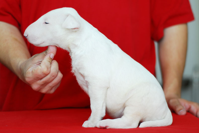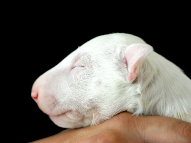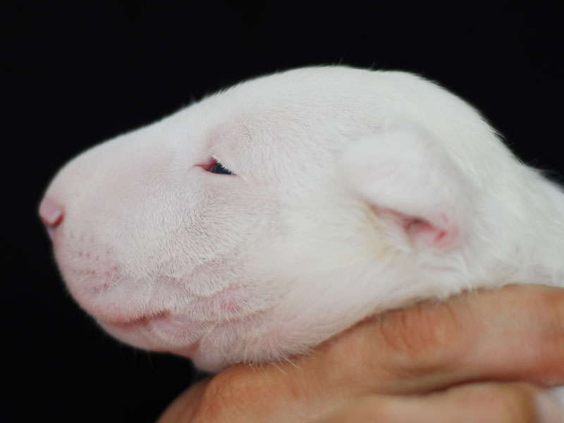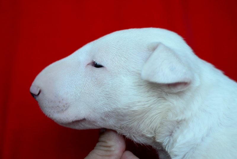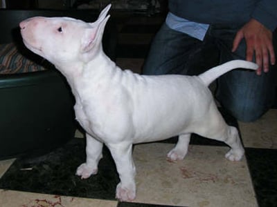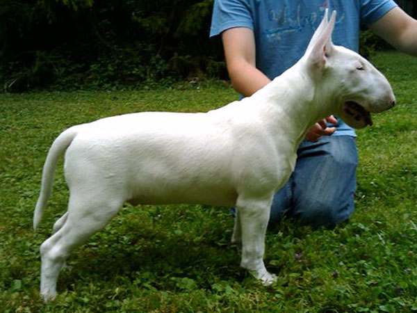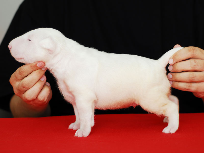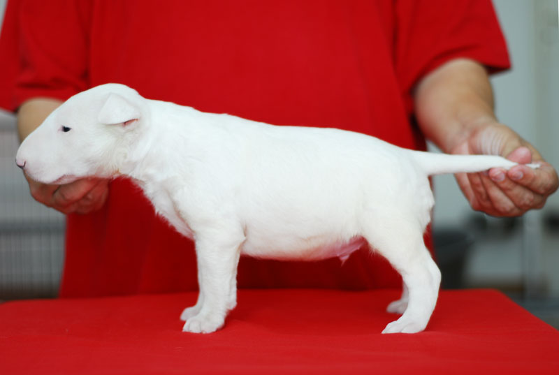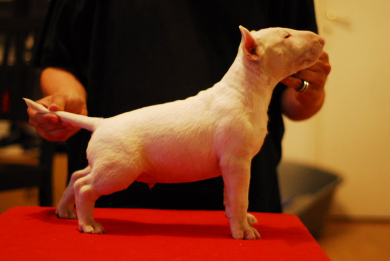 Typy white.Excellent head filled and turned.Enough bone for his size.Neat ears.Good topline.