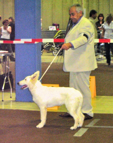 Jolie tête expressive et élégante - Bonne forme d' oeil - Bonne sortie d' encolure - Epaules correctes - APlombs et angulations corrects - très élégante - Manque d' assurance sur le ring. Démarche correcte.