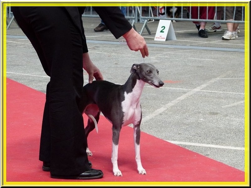 Sujet un peu léger, bonne tête, les oreilles pourraient être plus plaquées, très bonne encolure, voussure un peu marquée, croupe trop inclinée, très bonnes cuisses et jarrets, poitrine correct, angulation avant pourrait être plus marquées, ex pieds et fouet, ne prend pas assez de terrain en mouvement