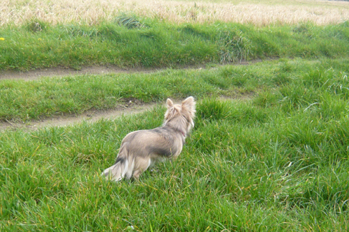 Stop devrait être plus prononcéTête devrait être plus pomméeExcellent yeux (forme et couleur)Très bon articuléExcellente ossature et forme de côtesEcellentes angulationsBonne qualité et condition de fourrureQueue portée timidementAntérieurs imparfaits à la marcheSe déplace correctement