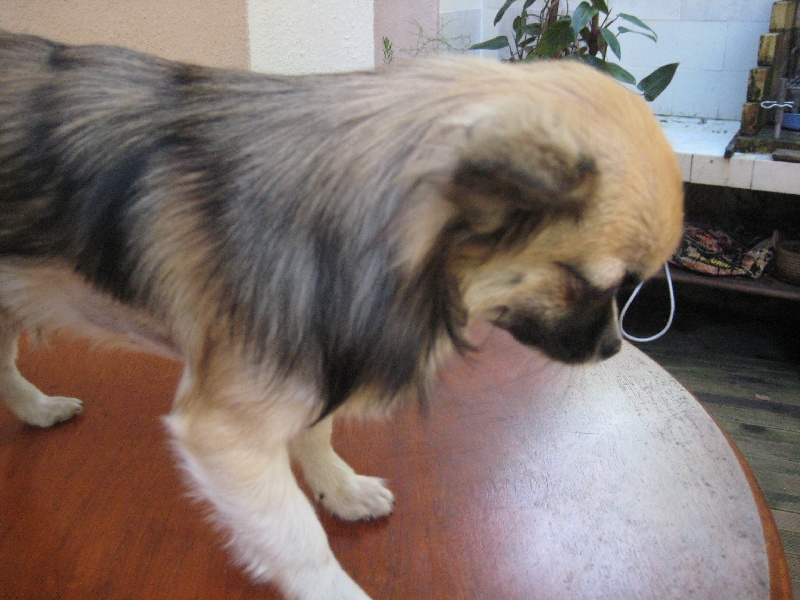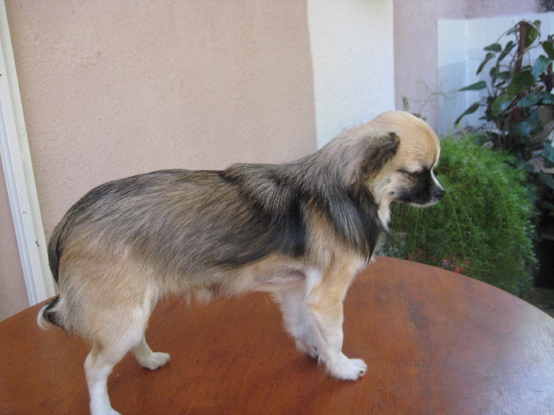 denture correcte, petite fontanelle ouverte, aplomb correct, b.tête, oeil noir, oreilles correctes bien portées, construction bien compact, poitrine bien galbée, mouvement et présentation excellente, manque de soie.