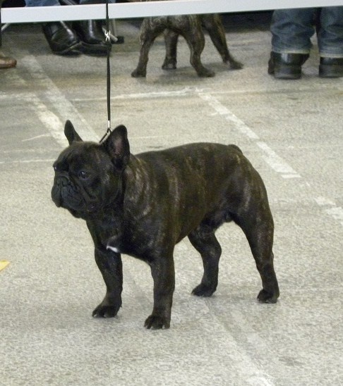 se presente bien ,B const ds ensemble ,solide et B compact.tête bon profil excellent crâne ,oreille B attachée et forme oeil excellent, manton large B éclaté ,excellent prognat ,B épaule musclée ,excellent côtes ,excellent oss ,queue 2 vert, RB pourait + marqué, excellent musculature et excellent bringure.