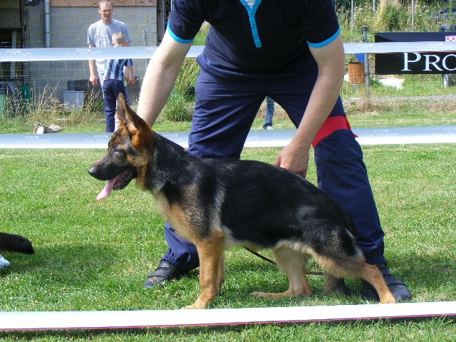 Chienne agée de 4 mois, présentant une belle image par sa construction. Malheureusement, sa fougue et son énergie ne lui permettent pas de démontrer les meilleures allures. Néammoins, au fil de la compétition, elle a montré une amélioration en arrachant moins le terrain et cherchant plus sa propriétaire.