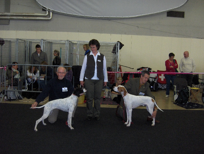Jolie chienne qui doit se souder. Le corps est bien construit avec une exc cuisse TB dessus TB poitrine La tête est assez typée,l'oreille pourrait être plus plate.