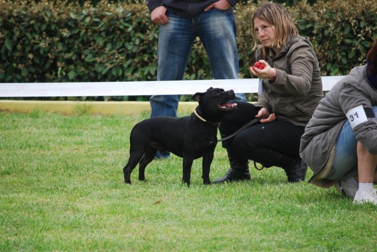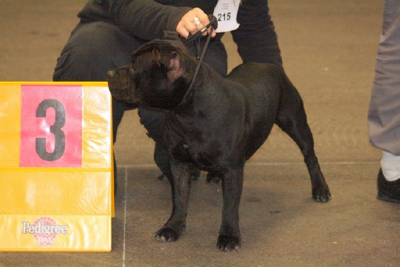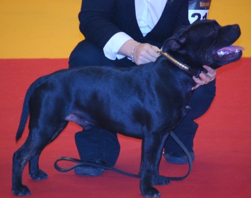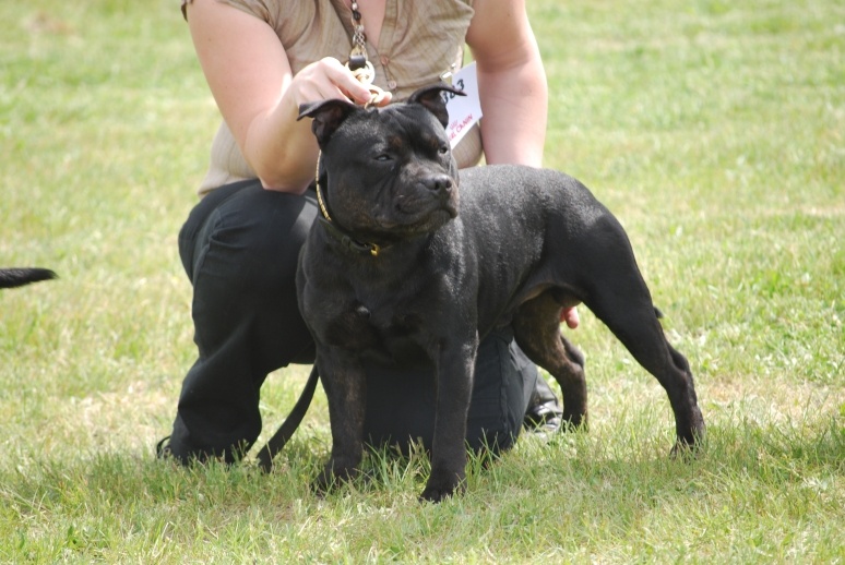 Black Brindle. Strong Head, Correct muzzle, Sound Bite. Deep brasket, broad front, level top line. Forequerters: stronght front, Hindquarters: good, Sound movements. Well balanced Stafford