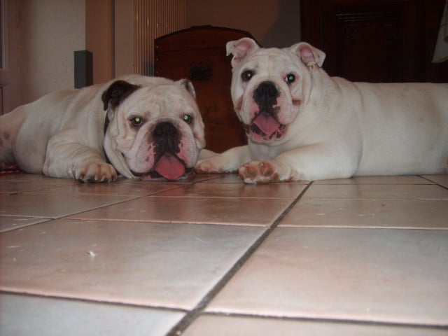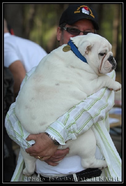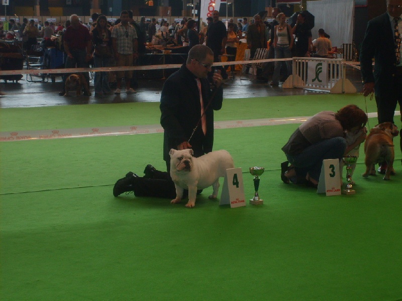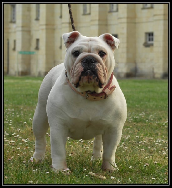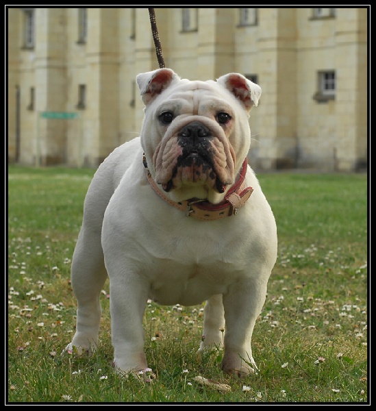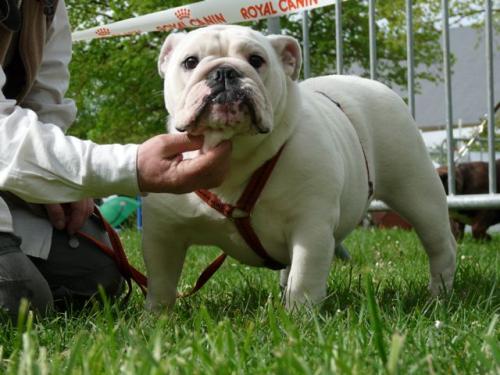 Blanc,en excellente condition,Sujet bien proportionné, très féminine,taille standard,beaucoup de substance,tête avec une bonne expression typique,crâne fort large et carré,excellent chanfrein,bon lay-back, narines bien ouvertes,bon cou,yeux bien foncés et bien placés,oreilles en rose, mâchoire large et bien recourbée,bonne ossature,bons aplombs avant,côtes bien rondes,bonne ligne de dessus,bon arrière main,bonnes angulations arrière,bons pieds,queue droite,démarche lourde et contrainte typique,excellente présentation,excellente respiration.