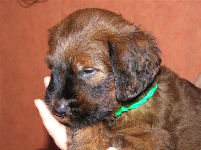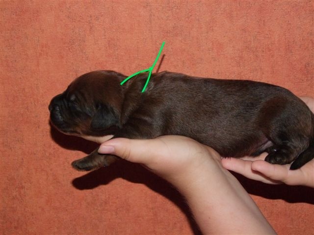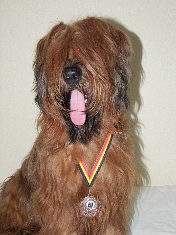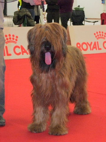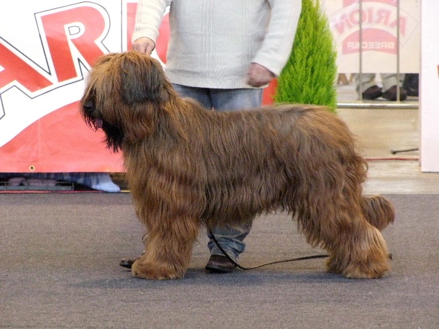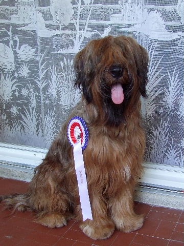 Jolie sujet, bien masculin.Exc tête, yeux, expréssion, oreilles. Dentition complète en pince. Exc encolure, poitrine, ligne de dos, croupe, queue. Exc angulation avant et arrière. Exc fourrure. Exc allures.