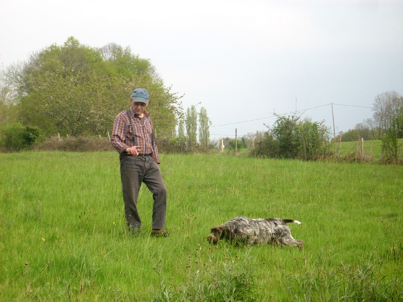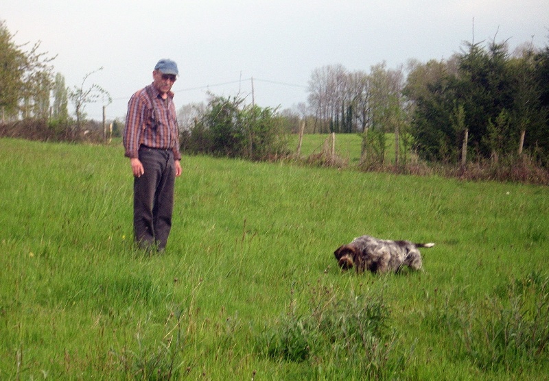 Conduite par Dominique Guillon Era passe sur un terrain très difficile et prends un excellent point sur caille dès le découplé de son parcours dans un style très korthals.Excellentes allures griffonne.Condition climatique très difficile,forte chaleur +de 30°C et terrain très sec;très peu de vent ce qui a rendue encore plus difficile les prises d'émanation.Photo:Era et Dominique Guillon avant le départ