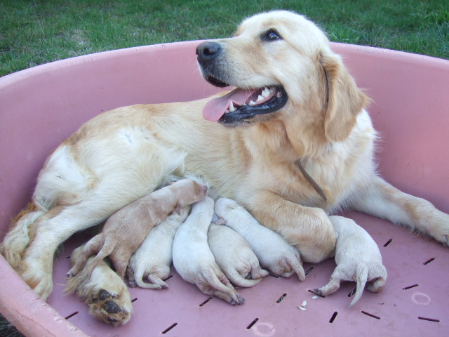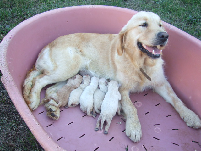 maman golden, bien dorée et très calme et patiente avec ses chiots. Fille de